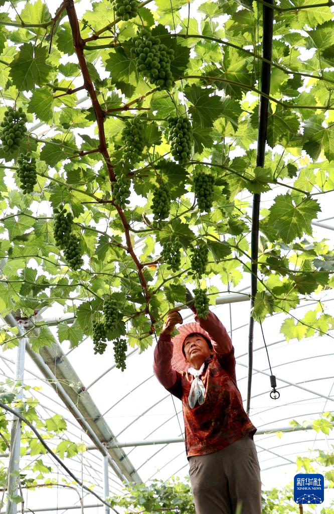 6月20日,山东省滨州市博兴县庞家镇的农民在管理葡萄。