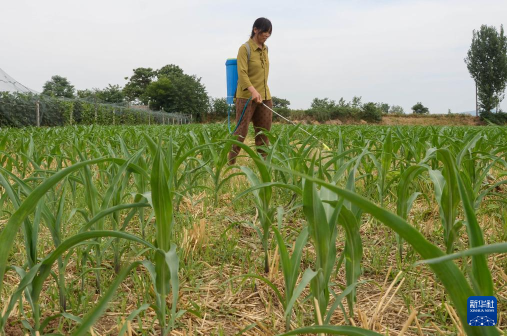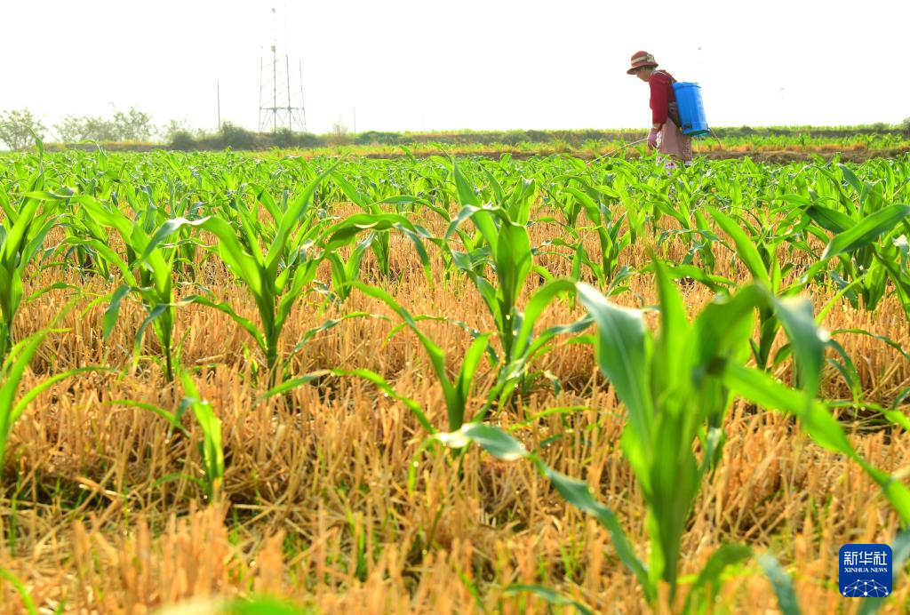 6月20日,山东省枣庄市山亭区桑村镇大郭村农民在玉米田喷洒农药。