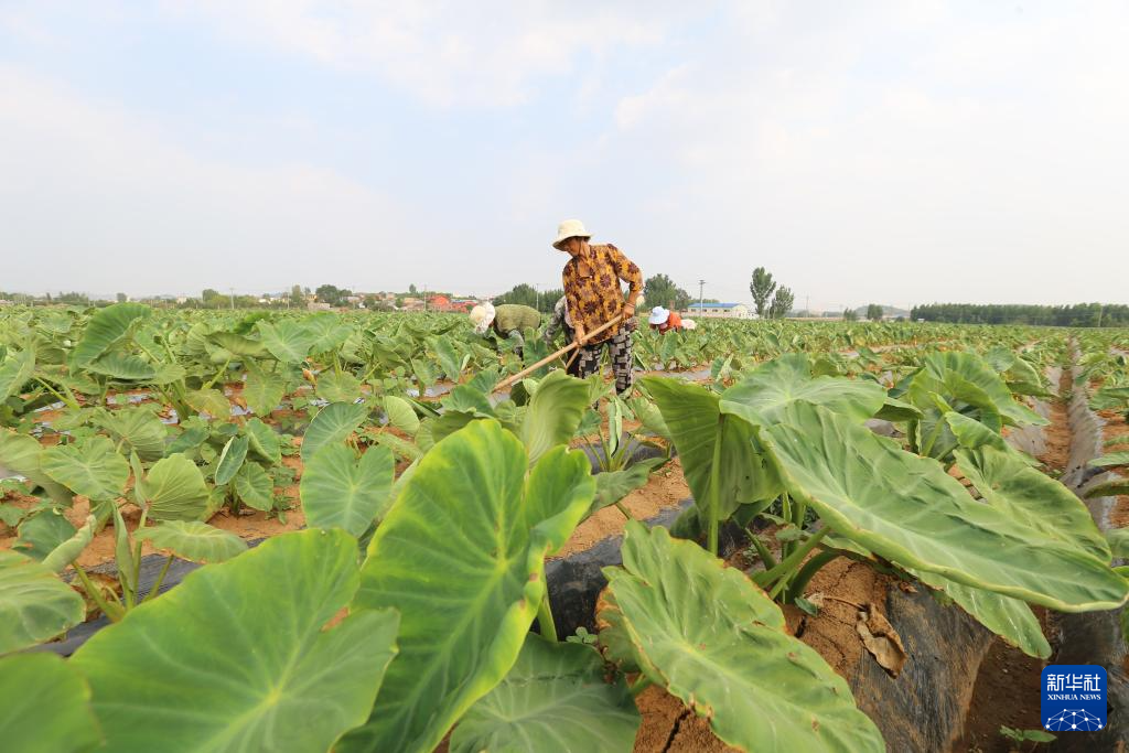 6月20日,农民在山东省枣庄市山亭区西集镇刘庄村毛芋头种植基地除草。