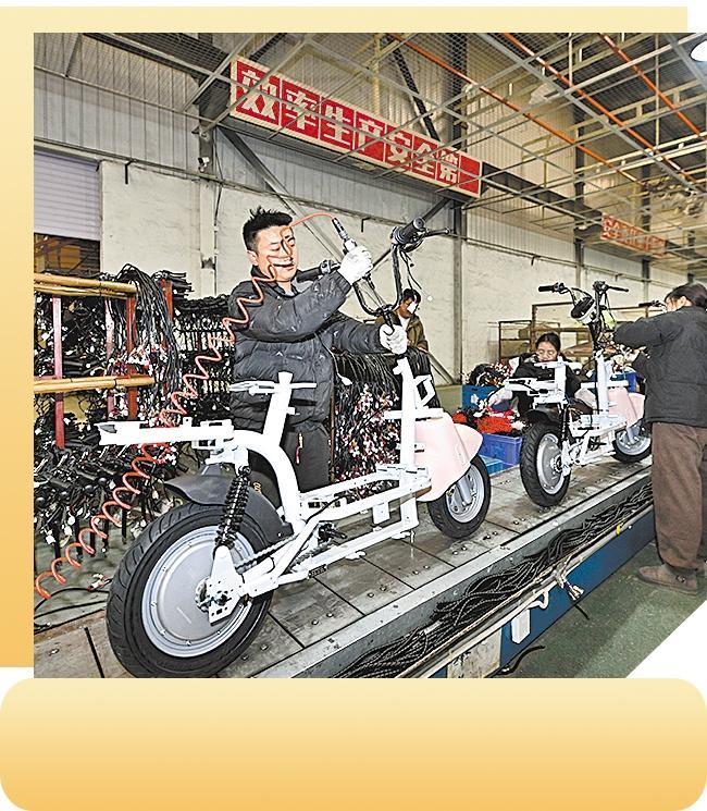 在天津市武清区王庆坨镇的天津踏浪科技股份有限公司生产车间内,工人在流水线上装配电动自行车。新华社记者 孙凡越摄