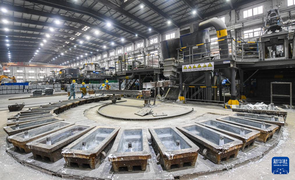 2月7日,在湖南省常宁市水口山经济开发区,湖南株冶有色金属有限公司熔铸车间工人在生产作业。