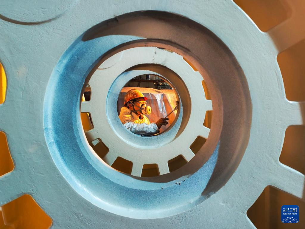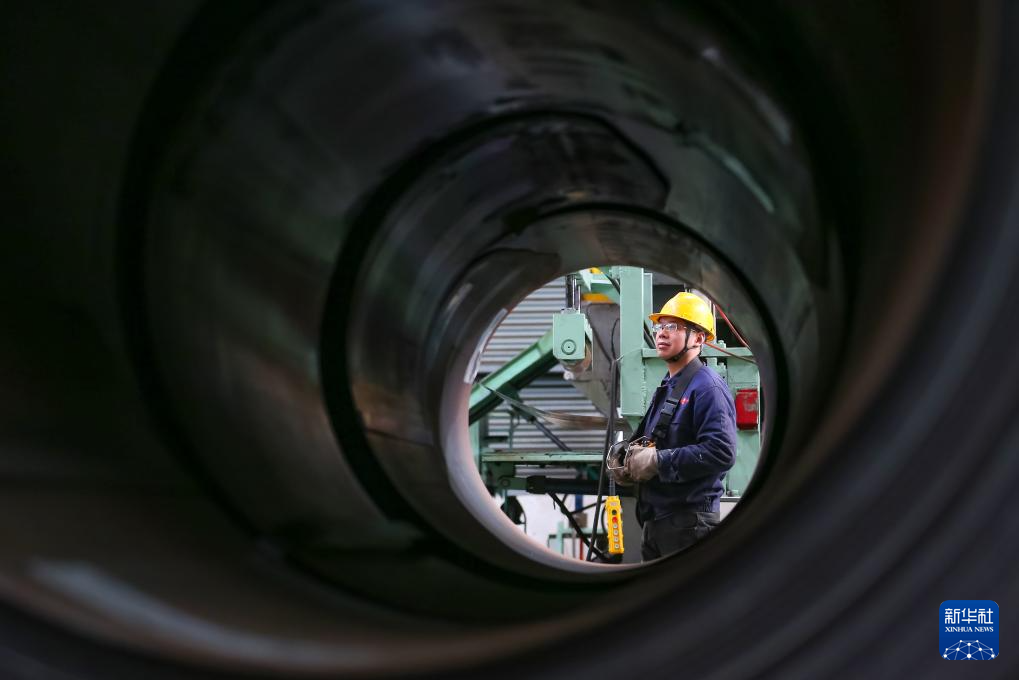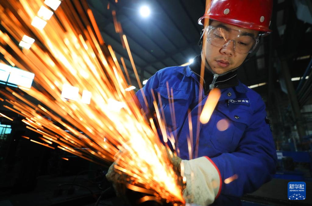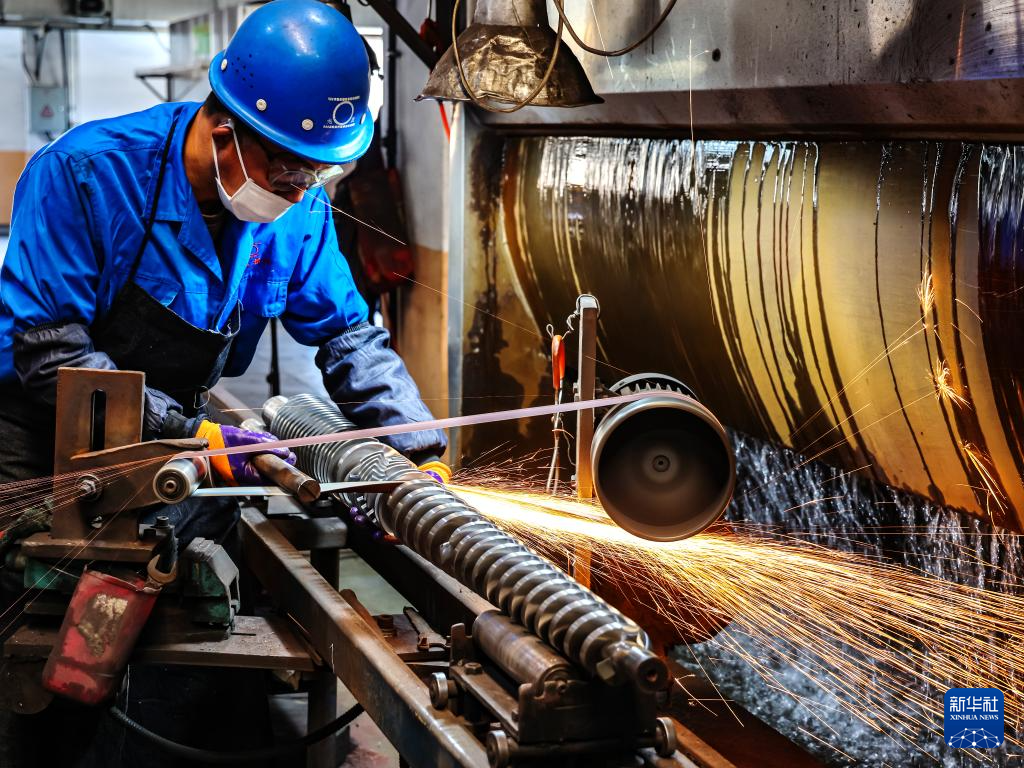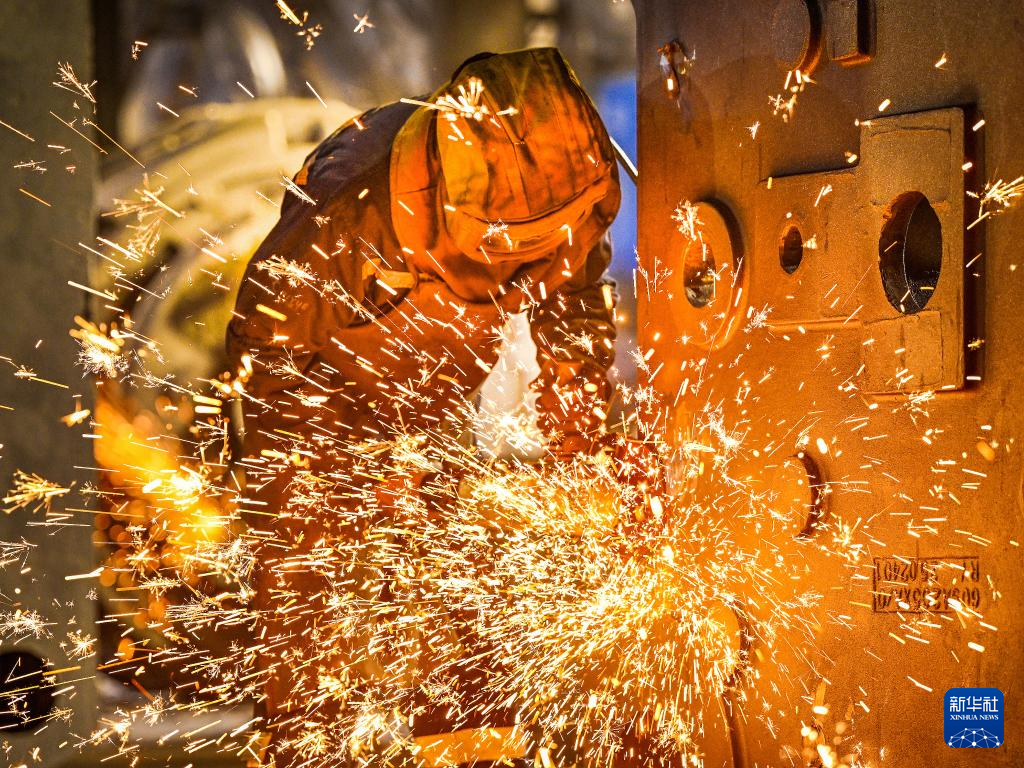 2月7日,在浙江省宁波市鄞州区东吴镇的日月重工厂区,工人打磨抛光风电设备部件。