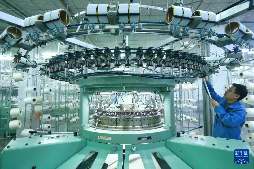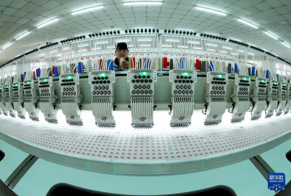 2月7日,山东省青岛市即墨区颐和针织有限公司工人在生产出口到海外市场的服装面料产品。