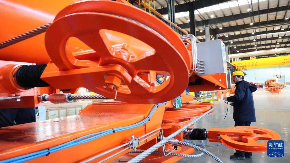 2月7日,在连云港经济技术开发区的连云港远洋流体装卸设备有限公司生产车间,工人组装流体装卸臂。