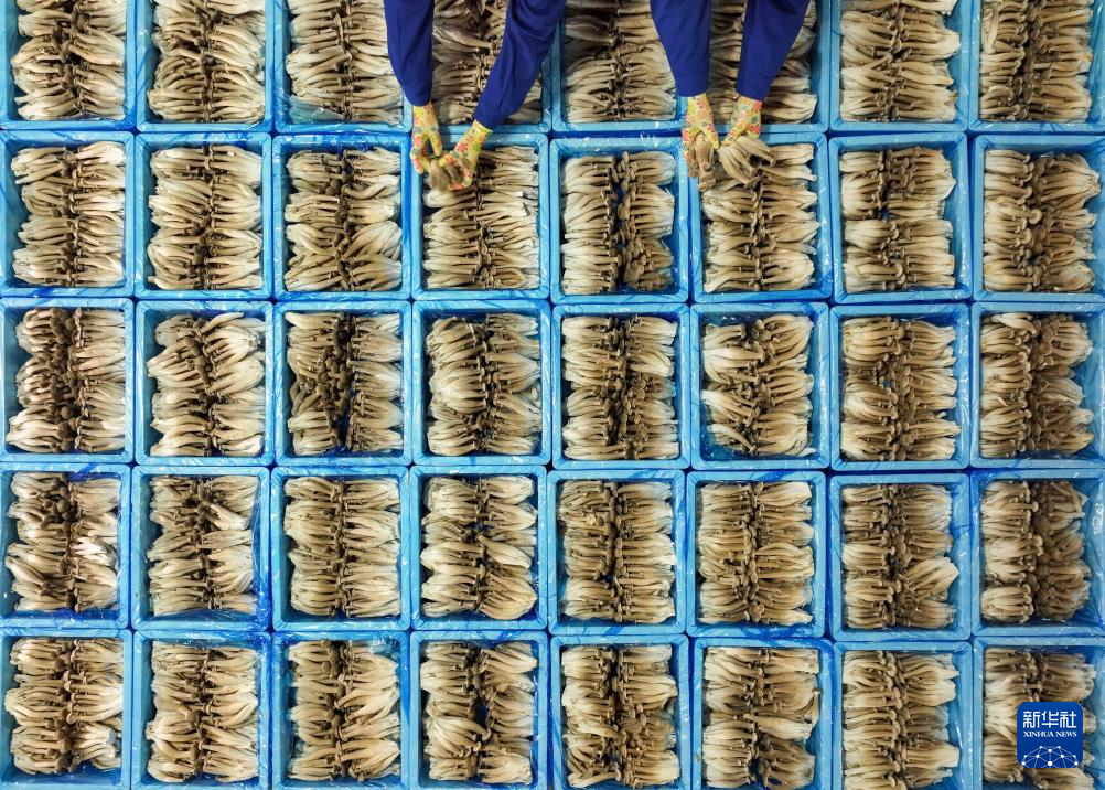 2月7日,在贵州省铜仁市玉屏侗族自治县一家食用菌生产企业,工人在车间采收鹿茸菇(无人机照片)。