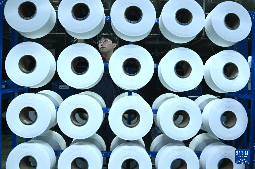 2月6日,在浙江义乌市北苑街道华鼎锦纶纺纱车间,工人在检查即将出厂的锦纶线卷成品。