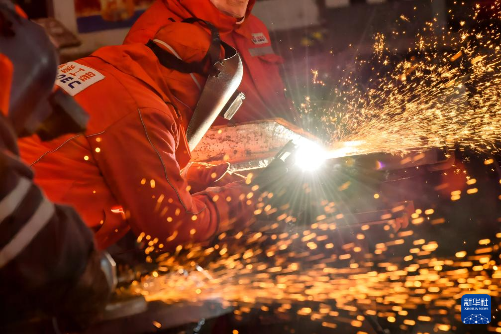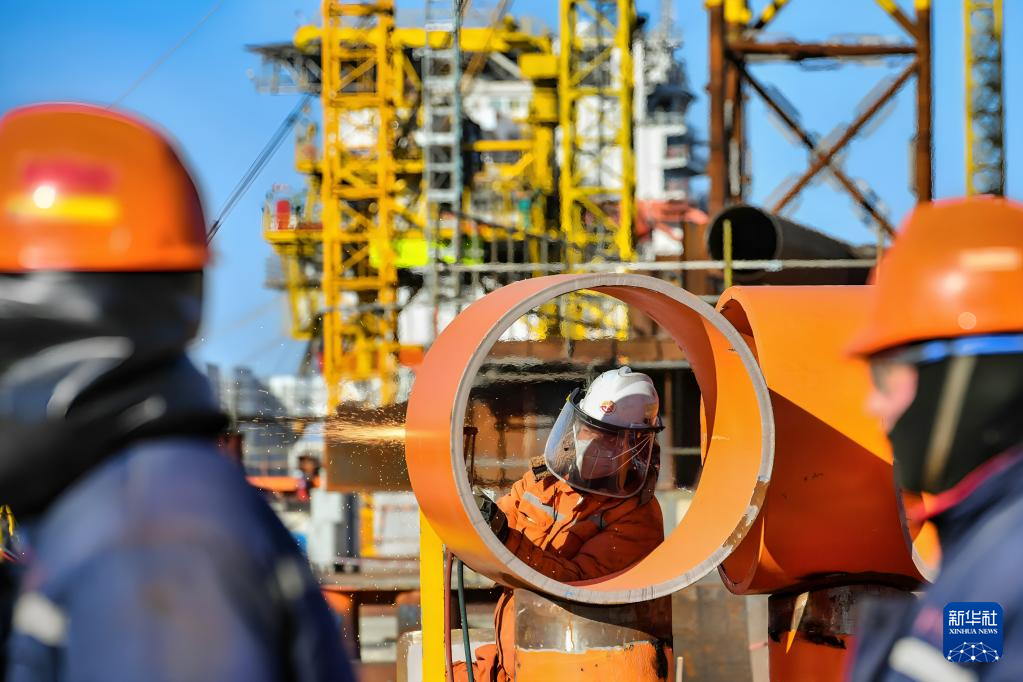2月7日,工人在海油工程天津智能化制造基地进行海上平台建造施工。