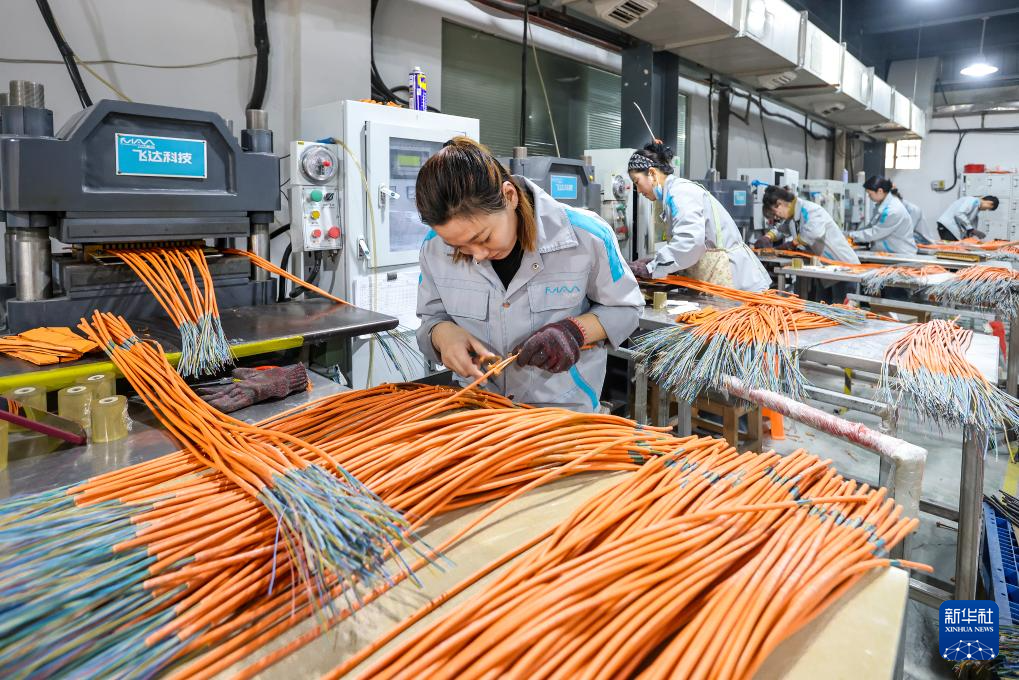 2月7日,位于浙江省台州市路桥区新桥镇的飞达科技有限公司生产车间内,工人在加工电线。