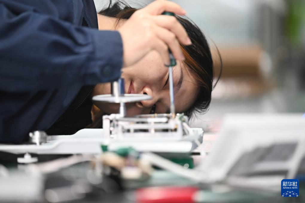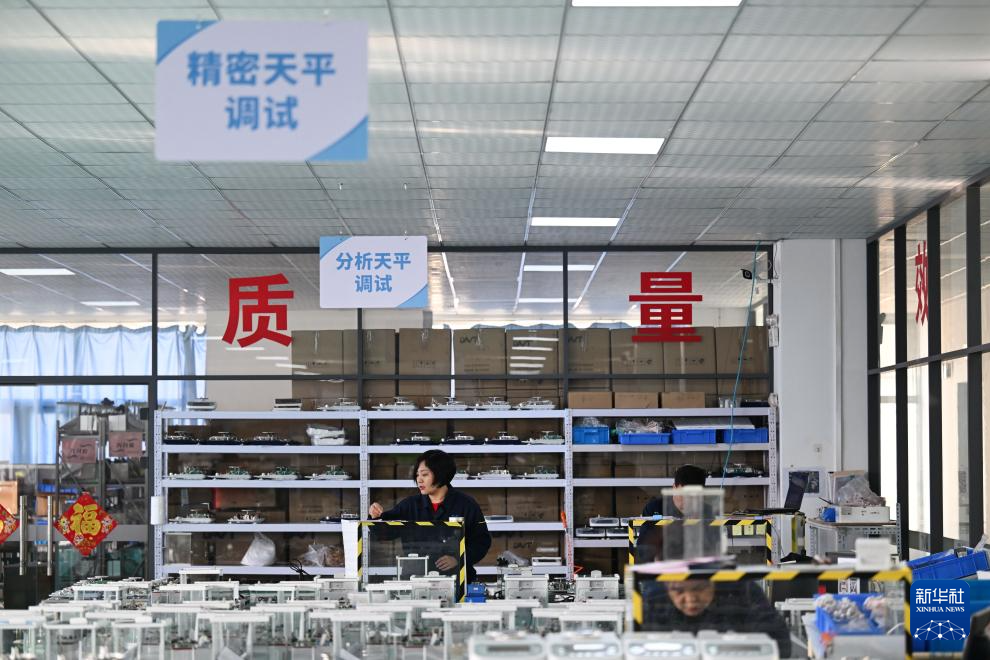 2月6日,在天津市西青区精武镇德安特传感技术有限公司,员工在调试天平。