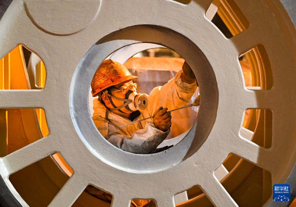2月7日,在浙江省宁波市鄞州区东吴镇的日月重工厂区,工人给风电设备部件涂喷油漆。