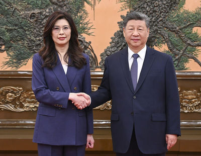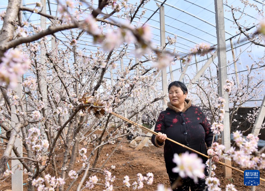 3月5日,山东省枣庄市山亭区水泉镇张山头村果农在果棚为樱桃花人工授粉。
