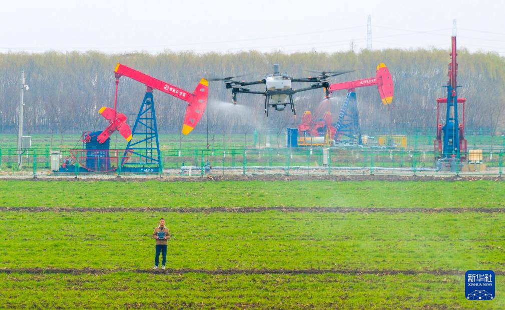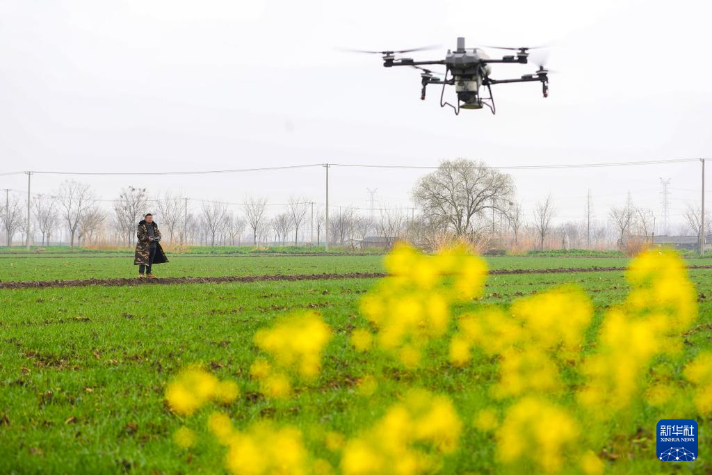 3月5日,在江苏省兴化市陈堡镇蔡堡村,种植户使用植保无人机为小麦施肥。