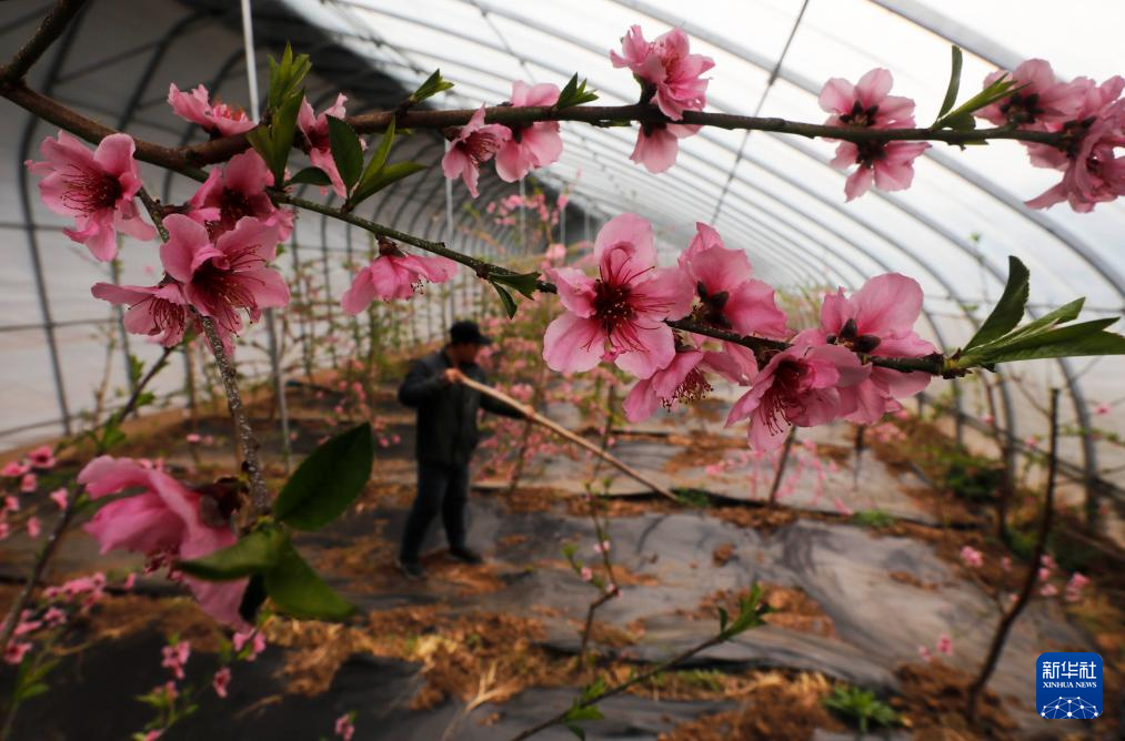 3月5日,在河南省武陟县圪垱店镇冯村一处温棚,农民在为桃树除草。