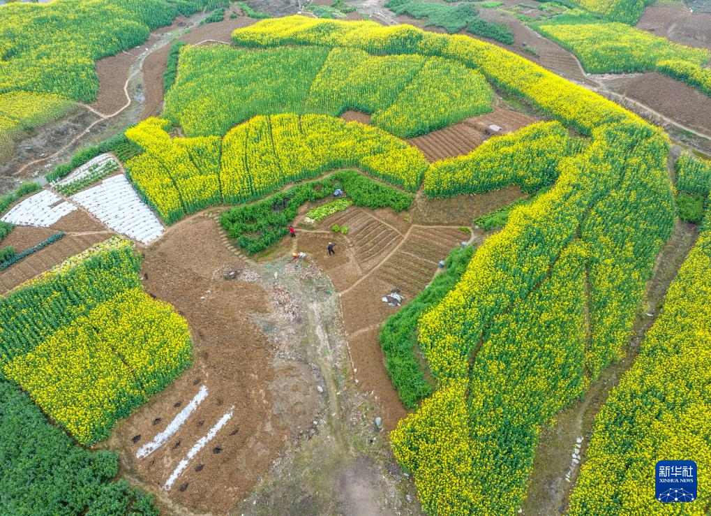 3月5日,湖北省秭归县茅坪镇银杏沱村村民在田间劳作(无人机照片)。