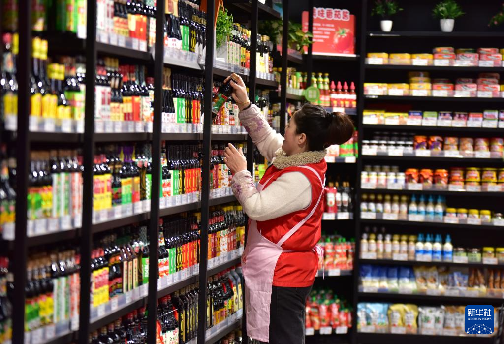3月9日,工作人员在安徽省阜阳市一家超市整理商品。