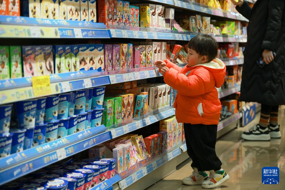 3月9日,小朋友在山东省枣庄市薛城区一家超市选购商品。