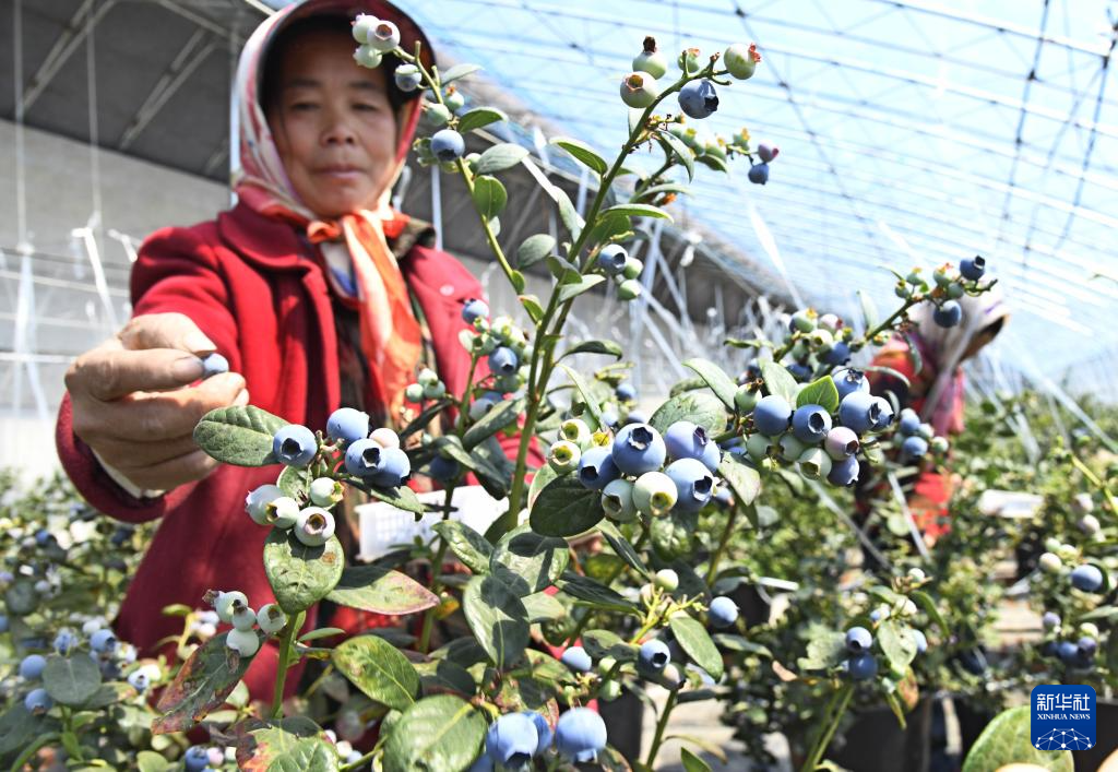 3月30日,村民在青岛西海岸新区张家楼街道丰禾园家庭农场采摘蓝莓。