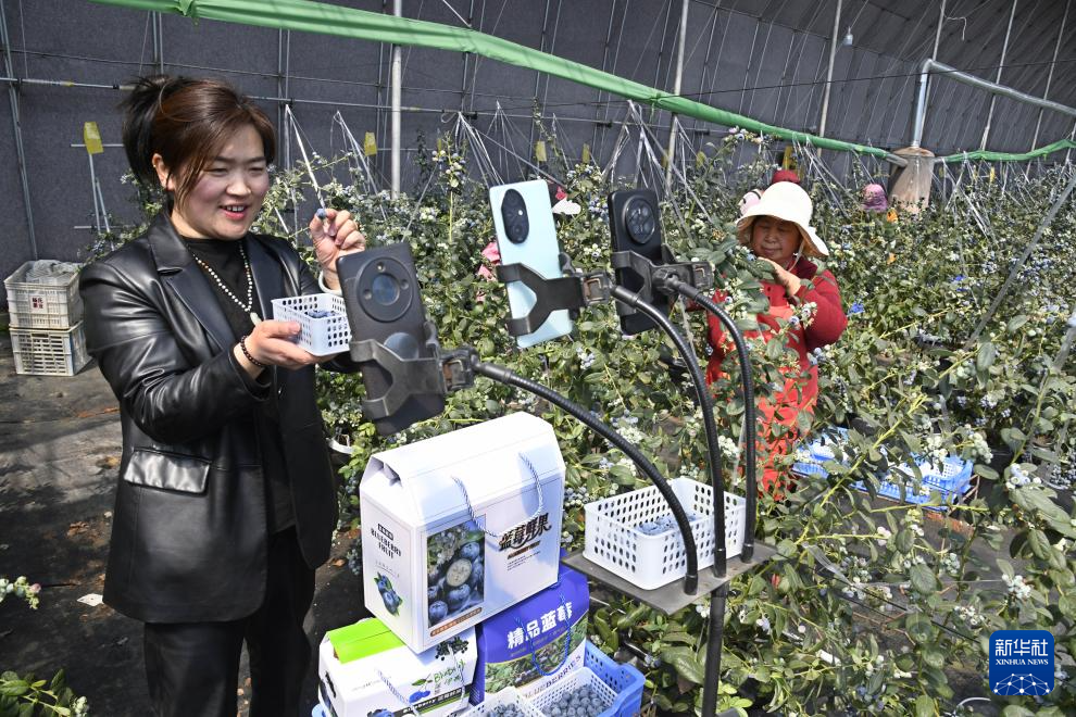 3月30日,在青岛西海岸新区张家楼街道丰禾园家庭农场,村民通过直播销售刚采摘的蓝莓。