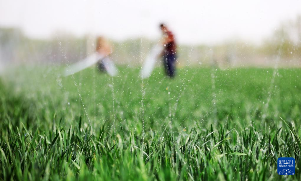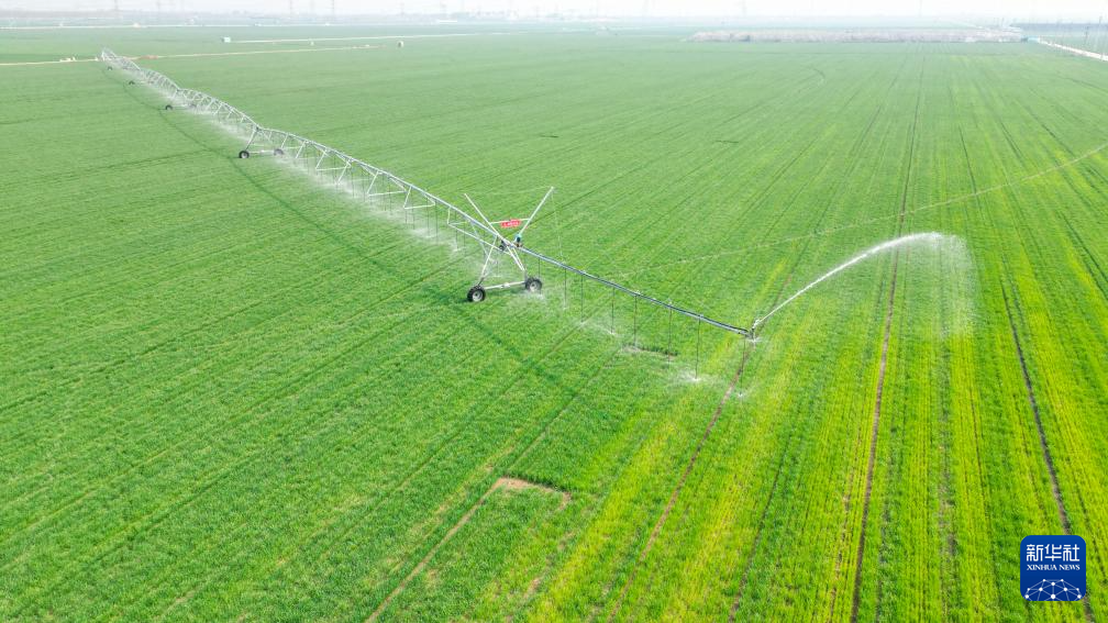4月9日,在山东省东营市广饶县李鹊镇的一处高标准农田里,桁架式喷灌机为小麦浇水(无人机照片)。