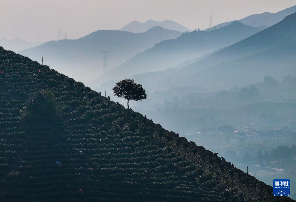 4月9日,茶农在浙江省建德市乾潭镇仇村村采摘春茶(无人机照片)。