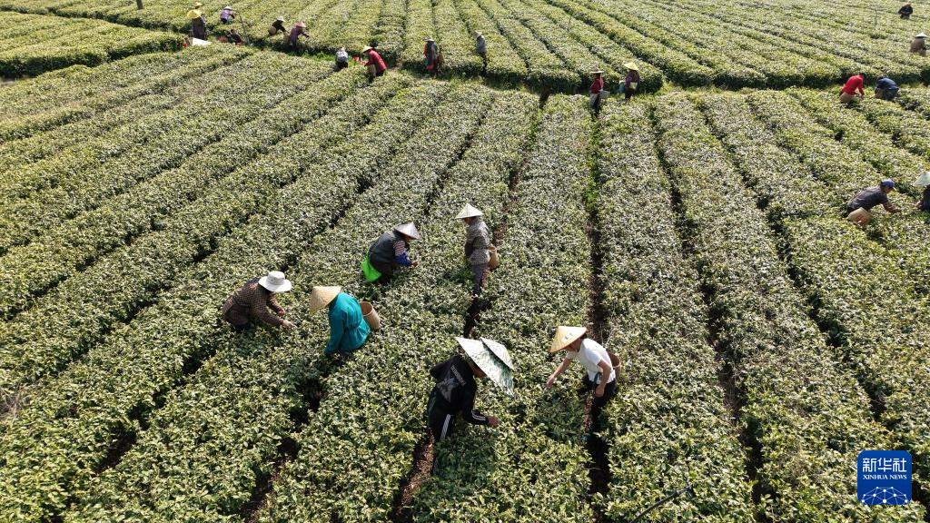 4月7日,采茶工在浙江安吉县溪龙乡黄杜村大山坞自然村的茶园里采摘春茶(无人机照片)。