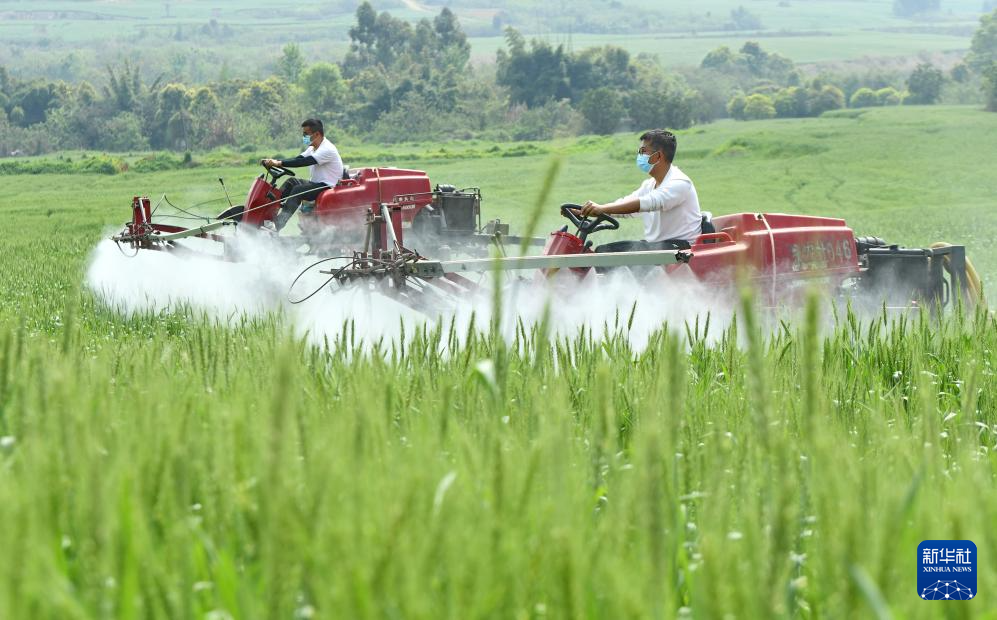 4月9日,在四川省成都市双流区黄水镇桂花社区,“95后”大学生、种粮大户郭嘉和张申杰驾驶自走式喷杆喷雾机对小麦进行植保作业。