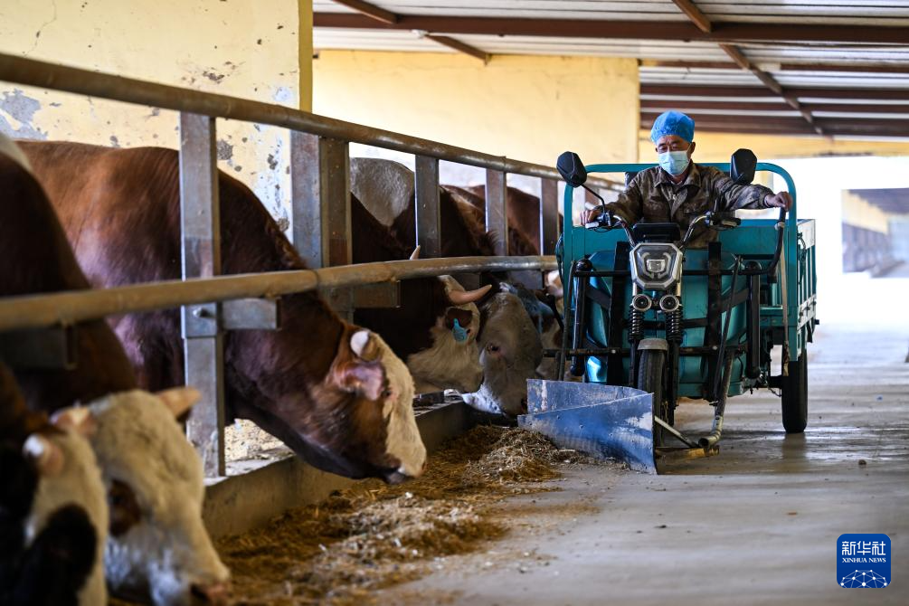 4月29日,工人在杭锦旗一家肉牛养殖企业喂牛。