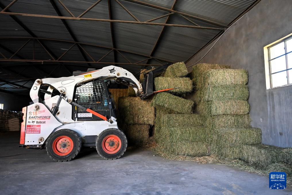 4月29日,工人在杭锦旗一家肉牛养殖企业操作机械设备搬运草料。