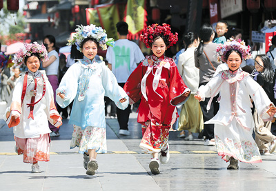 “五一”假期,小朋友身着汉服在河南省许昌市曹魏古城游玩。牛书培摄(新华社发)