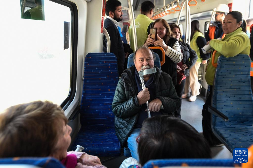8月25日,在智利圣地亚哥首都大区伦卡市,当地民众进入签约仪式现场停放的一辆中国制造的列车内参观。