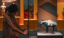 2025年7月27日,一名游客在陕西省西安市博物院参观拍摄唐代蓝釉点彩驮骡。(游青摄/光明图片)