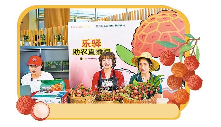 在广东包茂高速柏桥服务区,主播进行荔枝直播推介。新华社记者 邓 华摄