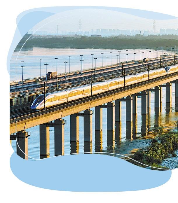 在江苏省昆山市,动车组列车通过京沪高铁丹昆特大桥阳澄湖段。 计海新摄(新华社发)