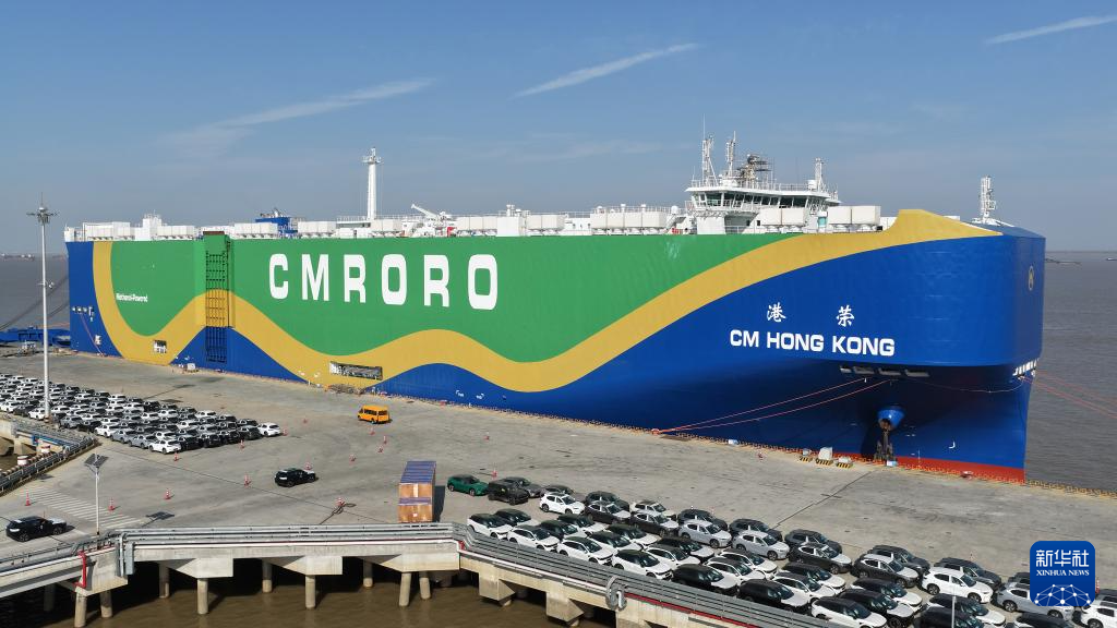 12月9日,在江苏省苏州港太仓港区,“港荣”号甲醇双燃料动力滚装船在装载出口汽车(无人机照片)。