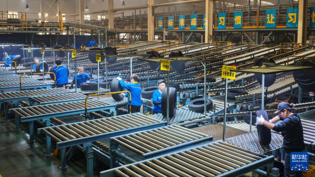 1月4日,在山东省东营市广饶县大王镇的一家橡胶轮胎企业,工人们对橡胶轮胎进行外观检查(无人机照片)。