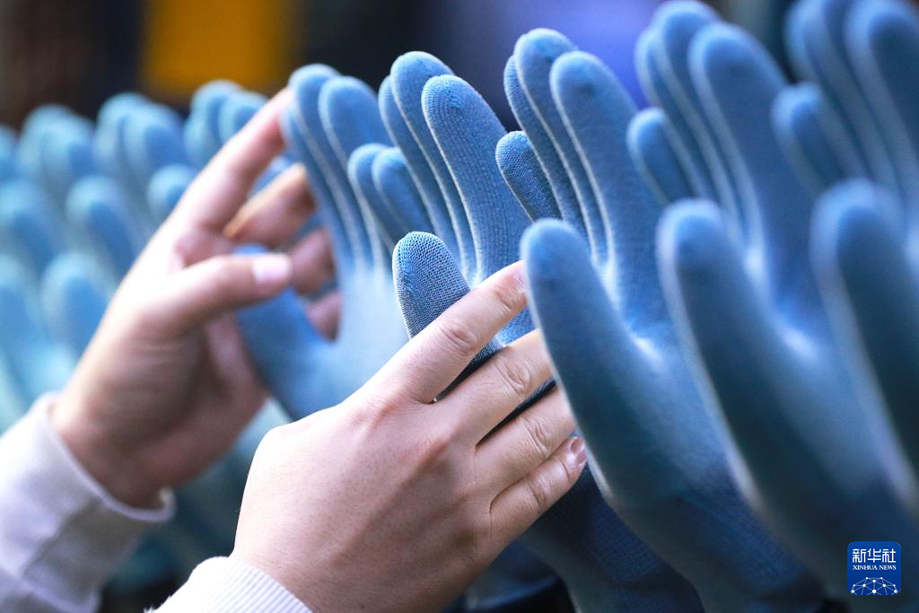 1月4日,在山东省高密市,一家企业的员工在车间生产防护手套。