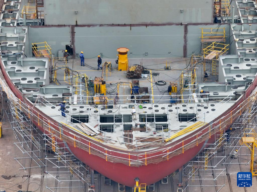 1月4日,在江苏省南京市一船厂内,工人们抓紧完成船舶制造订单(无人机照片)。