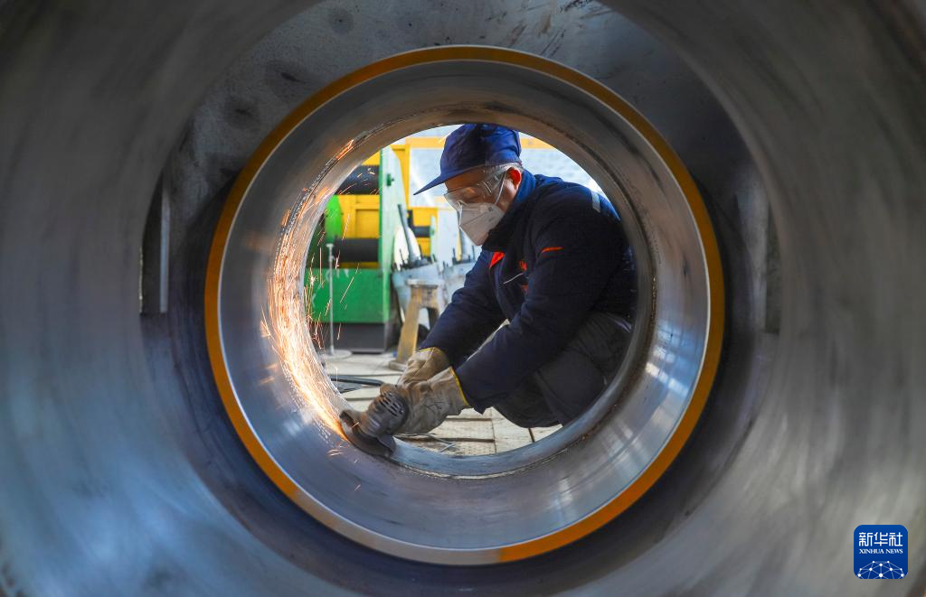 1月4日,工人在河北省唐山市海港经济开发区一家铁塔制造企业车间工作。
